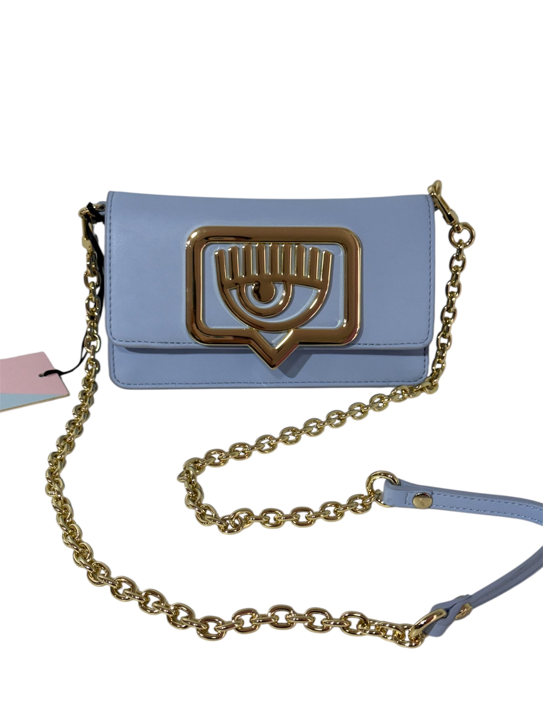 hermoso crossbody Chiara Ferragni color celeste detalles en dorado, asa de cadena tono dorada.