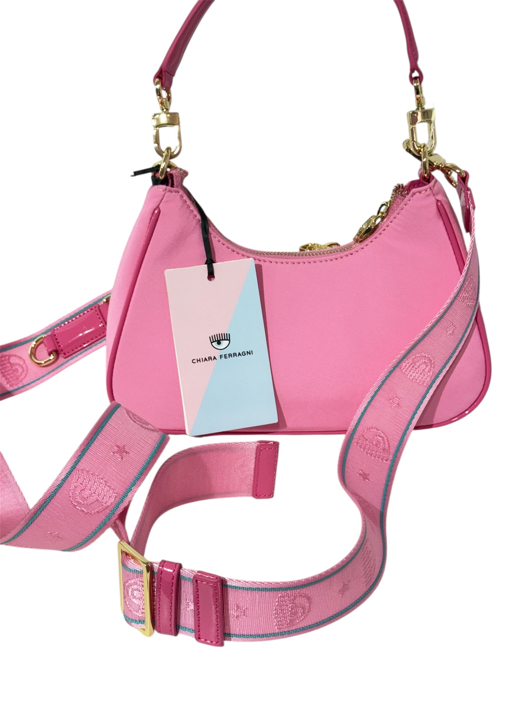 Hermoso Crossbody Chiara Ferragni, maravilloso diseño con una mezcla de juventud con elegancia, en tono rosado, bastante versátil. incluye bolsa guardapolvo.