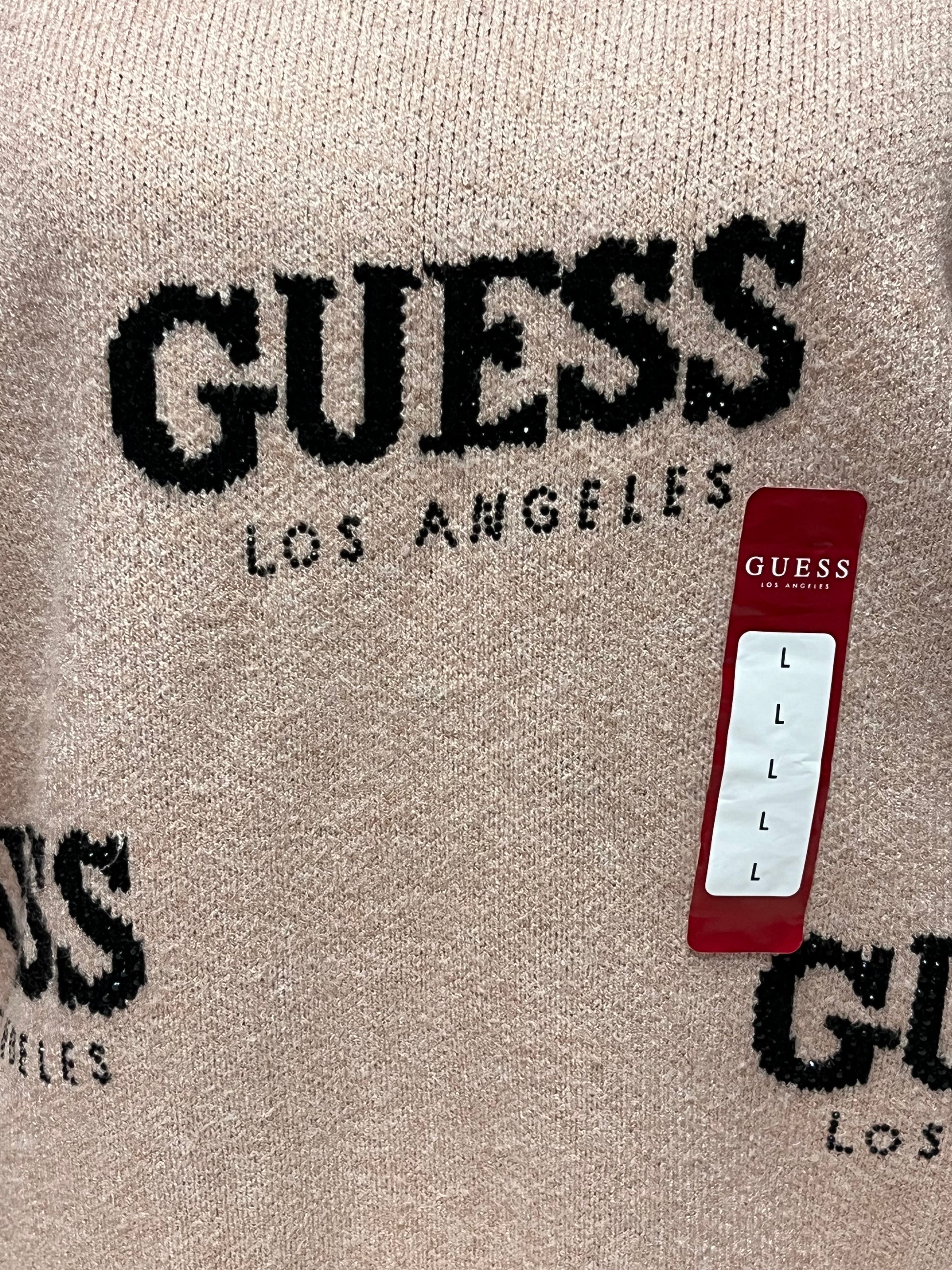 Sweater Guess en tono palo rosa con negro, diseño con stress en las letras, talla normal.